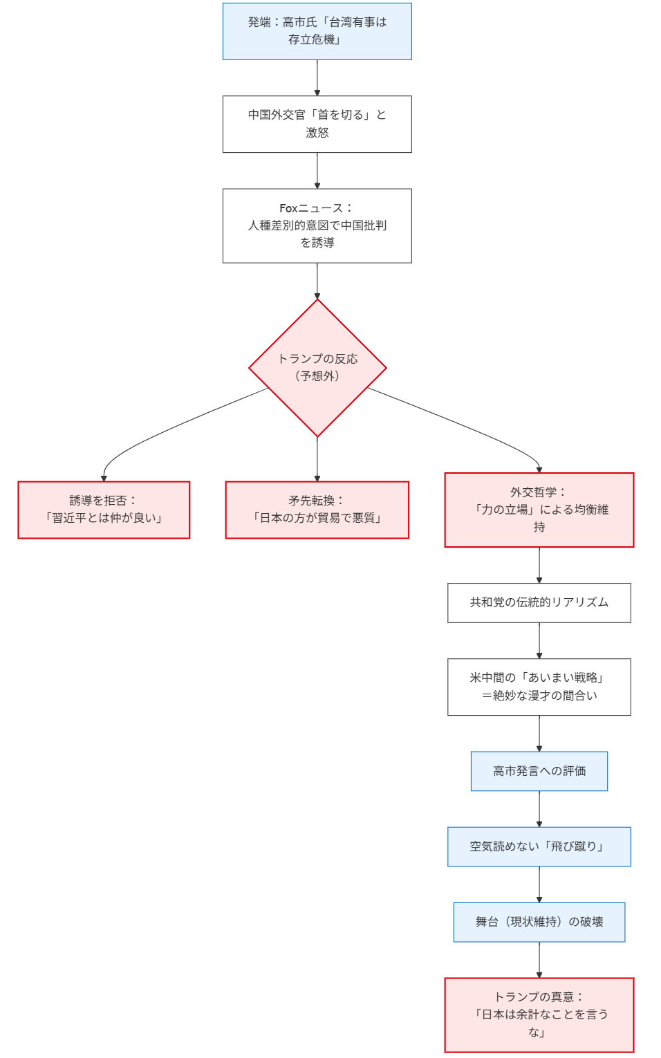 3. 日本の勘違い: 高市氏の断定的な発言は、米中が演じる高度な「漫才」の舞台をぶち壊す行為であり、トランプ氏から「黙ってろ」と釘を刺された形となる。