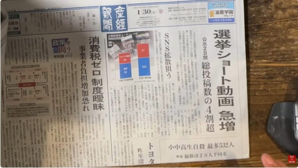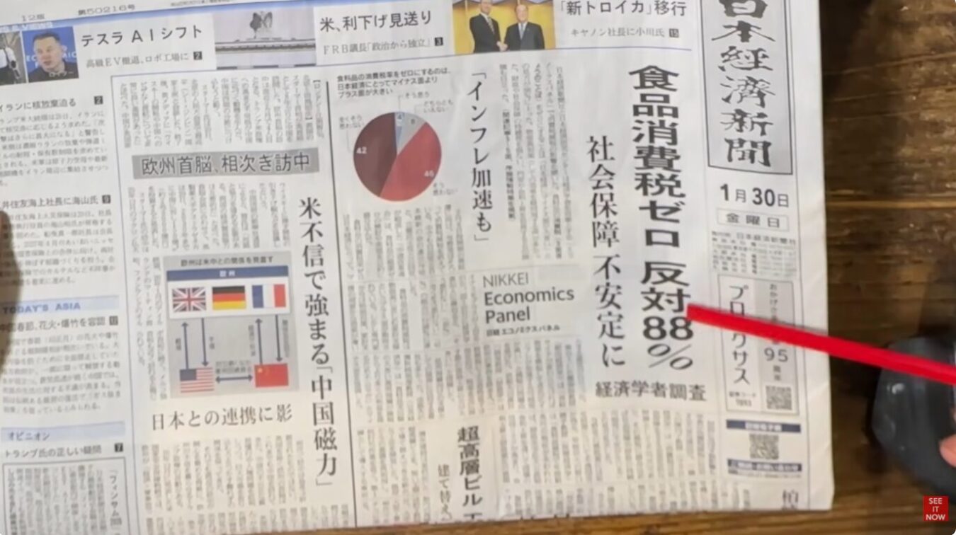 まず、朝刊のチェックから入ろうか。 日経新聞が一面で「食品消費税0、反対88%」なんて記事を出している。経済学者にアンケートを取ったらこうなったと言うんだが、こんなもん、単なる**「ポジショントーク」**に過ぎない。
