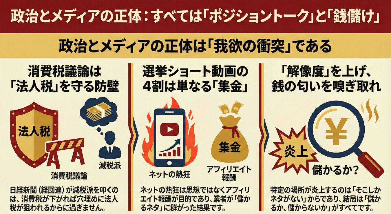 メディアの動きといえば、産経新聞が「選挙ショート動画急増」と報じている件もそうだ。「投稿数の4割超が選挙関連」だと言うが、これを「ネットの熱狂」だとか分析してる奴は解像度が低すぎる。 これは**「銭儲け」**の話だ。