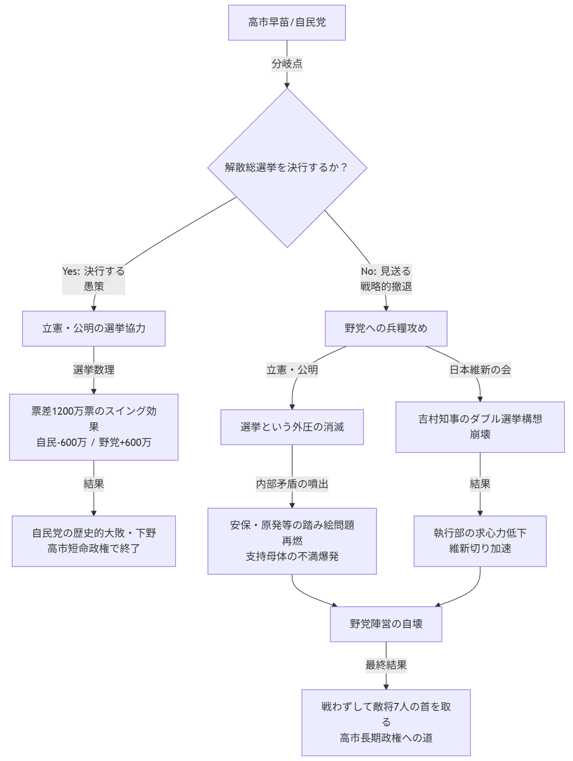 • 戦わずして「敵将7人」の首を取る: 解散をやめるだけで、野田代表(立憲)、安住氏、斉藤鉄夫、西田実仁幹事長、吉村知事(維新)、藤田幹事長、横山大阪市長ら、野党主要人物の政治生命を絶つ(首を取る)ことが可能になると指摘しました。選挙という目標が消滅すれば、彼らは党内をまとめきれず、責任問題に発展するためです。