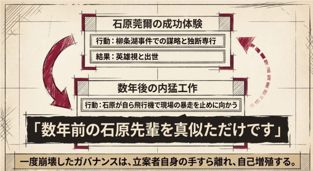 • 陸軍中央のガバナンス崩壊: 陸軍内部では、中国の戦力を侮り「一撃」で屈服させられるとする拡大派(武藤章)と、対ソ戦備を優先し慎重な態度をとる不拡大派(石原莞爾)が対立した。しかし、かつて石原自身が上官の命令を無視して満州事変を主導した経緯から、陸軍内には下剋上の風潮が蔓延しており、石原の説得は若い将校たちに響かなかった。