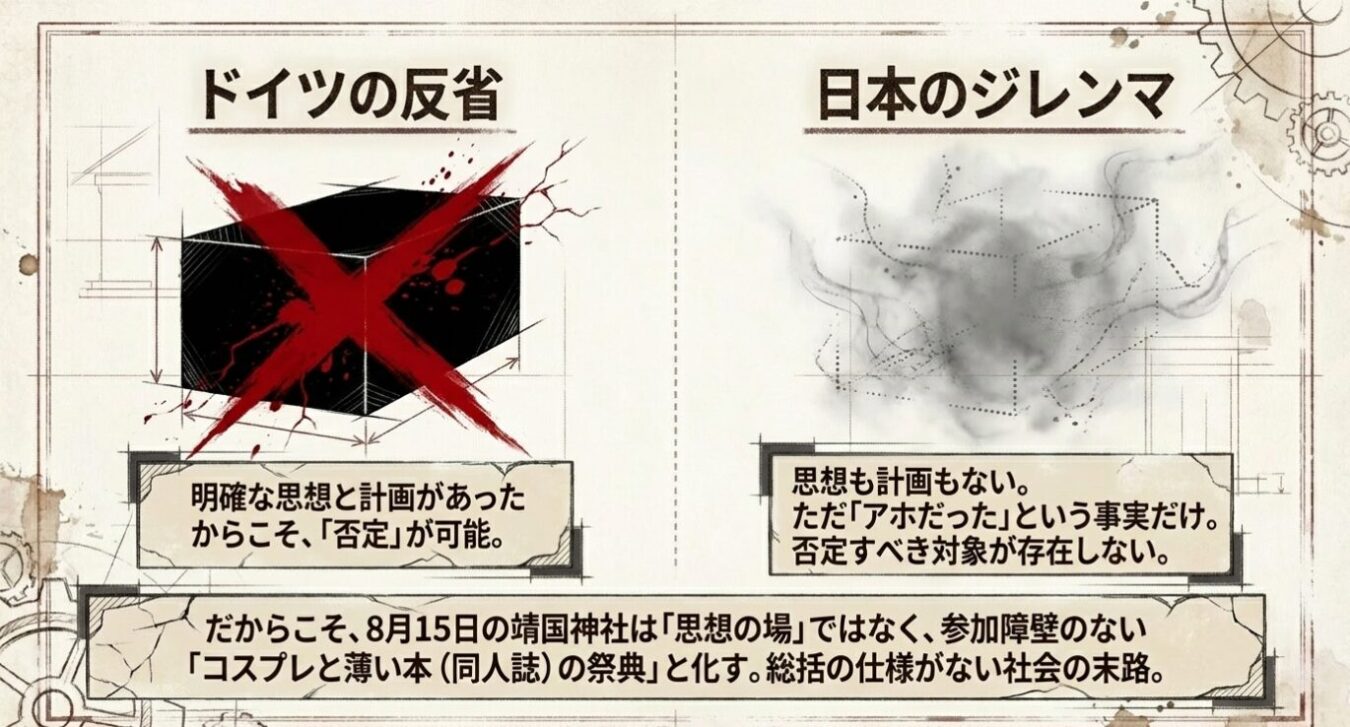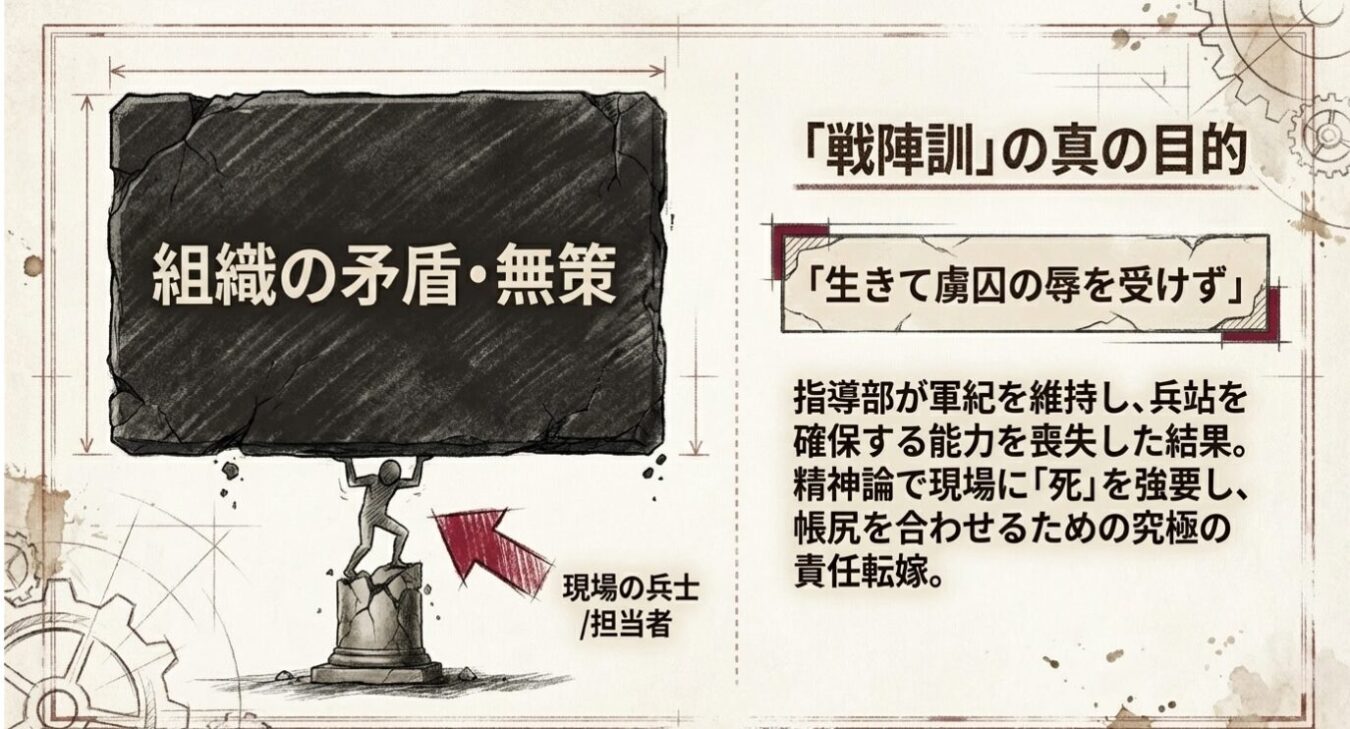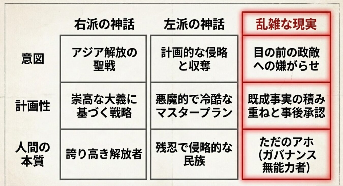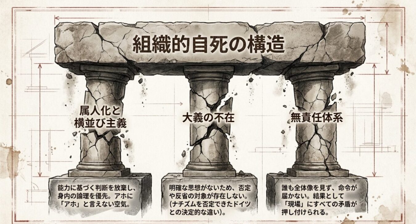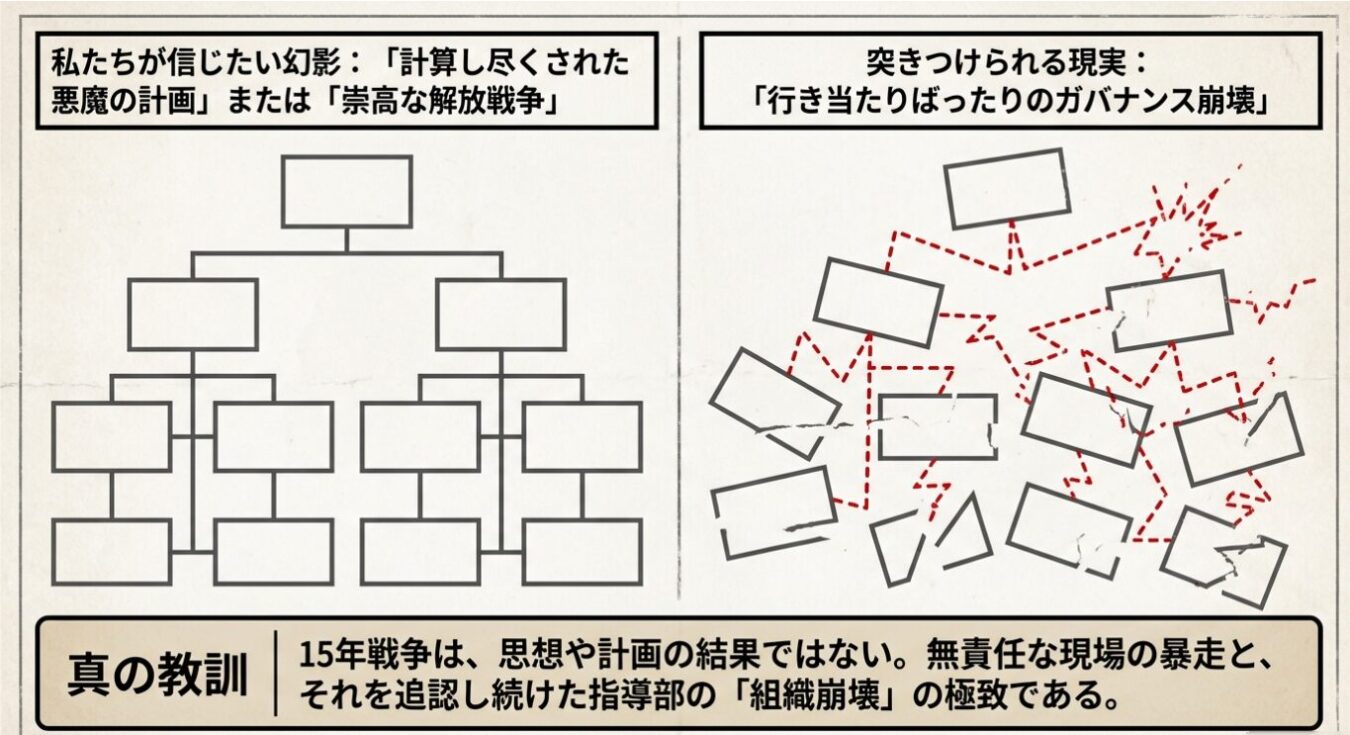 • 陸軍の組織エゴ: 撤兵による組織の瓦解を恐れた陸軍は、自らの延命のために国家全体を道連れにした。