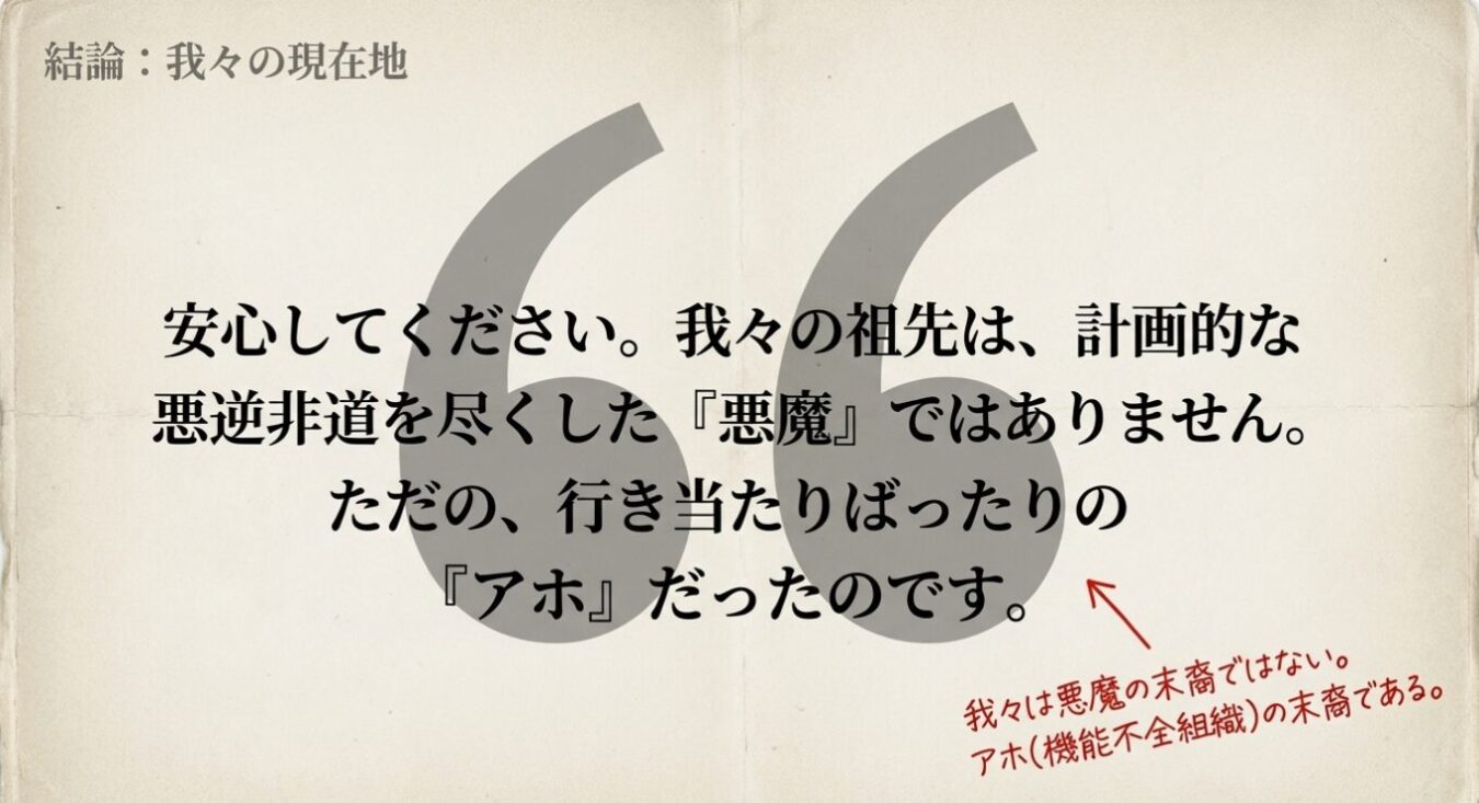 • 指導層の無責任: 天皇やその側近、政治家たちは、皇室の安泰や一時の世論を優先し、決定的な局面での決断を回避し続けた。