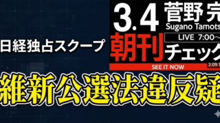 国際情勢 日経新聞が報じた「維新の会」公選法違反疑惑!予算案強行に隠された矛盾とは 日経新聞が猛批判する維新の会の公選法違反疑惑と、高市陣営による予算案強行の裏側を徹底解説。選挙演説の広告利用の違法性や、予算成立を急ぎながら消費税減税を先送りする与党の矛盾を暴き、モラルが欠如した国内政治の異常事態に警鐘を鳴らします。 2026.03.04 国際情勢日本維新の会
