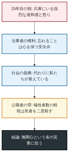 - 当事者はサバイバーズギルトを抱えずに「忘れていい」: 忘却は人間を健全に保つ安全弁であり、当事者が安心して忘れるためには、第三者である社会が「代わりに覚えている」という前提が不可欠である。