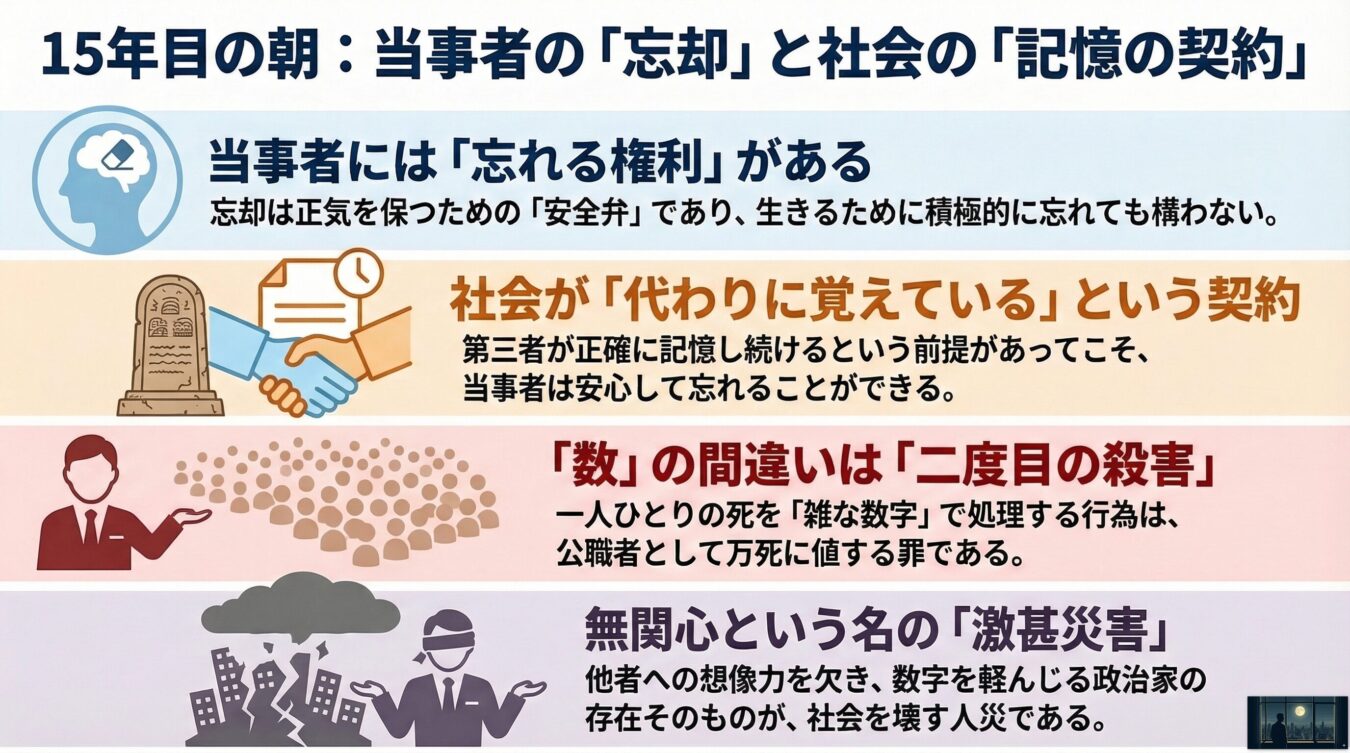 未曾有の犠牲を出した震災から15年目の朝。もしあなたが被災の当事者であるならば、無理に記憶に留める必要はありません。生きるために、積極的に忘れてもいいのです。しかし、当事者が安心して忘れるためには、第三者である「社会」が過去の犠牲を正確に記憶し続けるという絶対的な契約が必要です。だからこそ、公職にある者が犠牲者の「数」を間違えるという行為は、決して単なる失言で済まされるものではありません。それは、一人の人間の重い死を「雑な数字」として処理し、二度殺すに等しい行為だからです。本記事では、記憶の風化が進む現代において、政治家に求められる最低限の倫理と、忘却に抗うことの意味を問います。