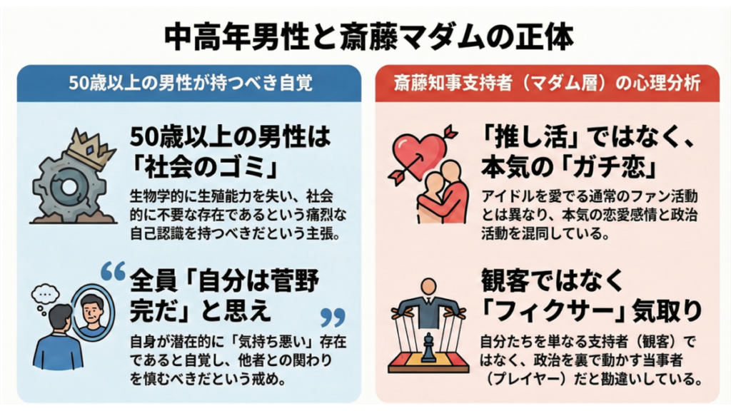 生物学的な役割を終えた自身の社会的立ち位置を客観視できない男性は、ハラスメントという形で個人的な加害を引き起こします。一方で、政治の単なる支持者である自身の立場を客観視できず、プレイヤーであると錯覚する人々は、健全な政治的議論の土壌を破壊するという社会的な加害を引き起こします。前者は個人の尊厳を、後者は民主主義の健全性を蝕む、極めて危険な存在です。