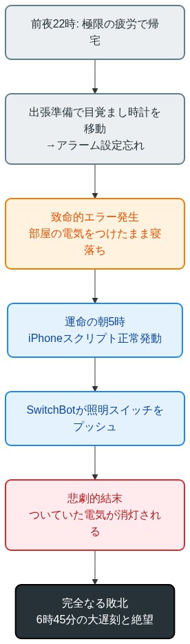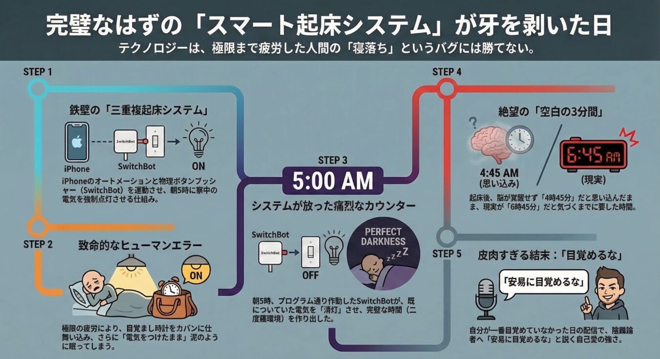 - 完璧なシステムの構築: iPhoneのホームオートメーションと物理ボタンプッシャー(SwitchBot)を連携させ、朝5時に強制的に部屋の明かりをつける万全の寝坊対策を敷いていた。
