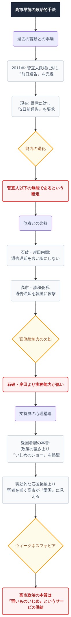 【結論】 高市早苗氏が野党時代に掲げた「質問通告の迅速さ」という自らの基準に照らせば、現在の彼女は「宿敵」であったはずの菅直人氏よりも無能である。彼女の政治的本質は、具体的な政策能力ではなく、支持層に対して「弱者(野党)を叩くショー」を提供する「弱いものいじめの政治」に集約される。