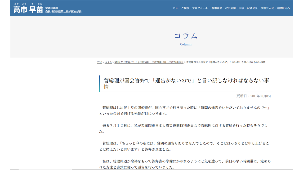 高市氏自身は、自民党が野党時代(2009年~2012年)であった2011年8月の自身のブログ(コラム)に、当時の国会質疑について記述を残しています。