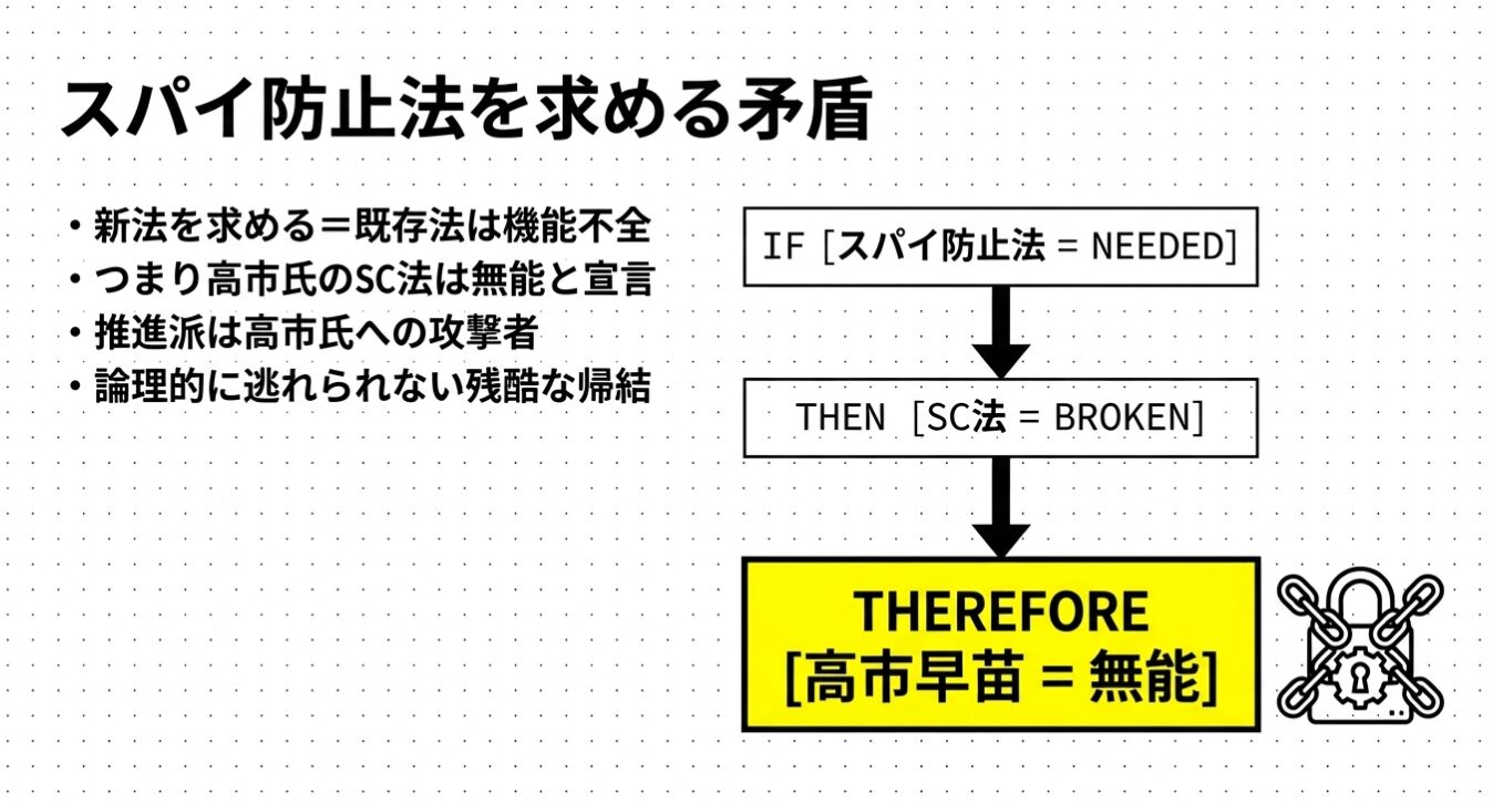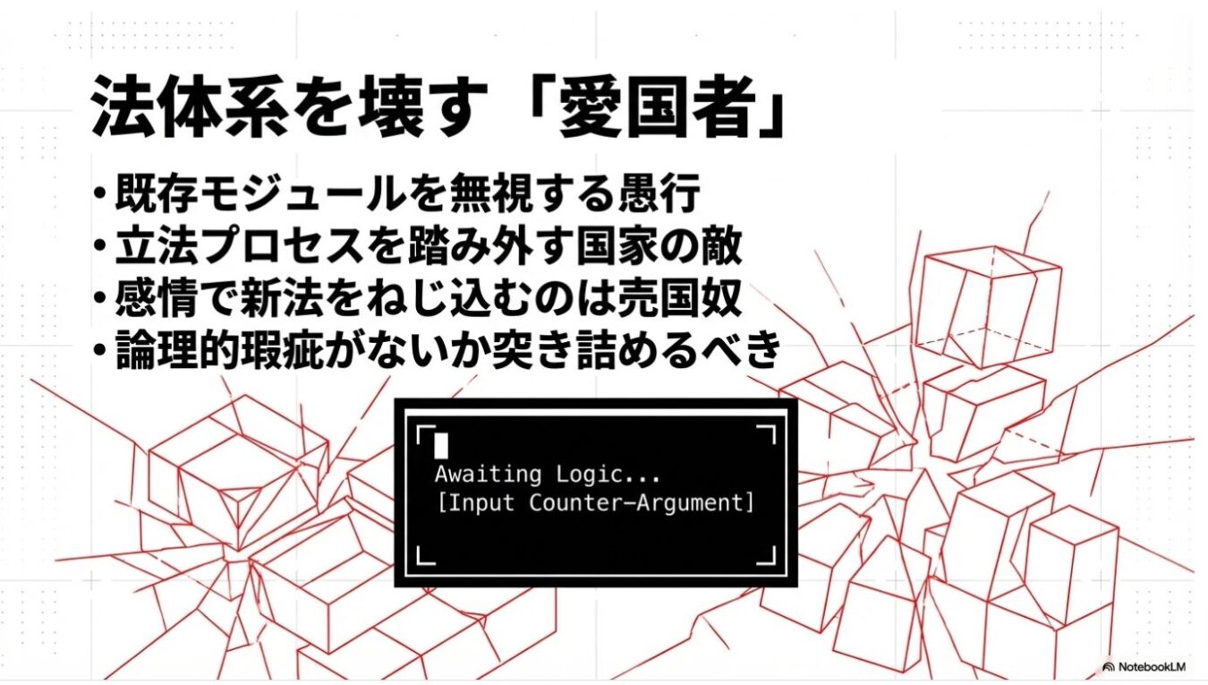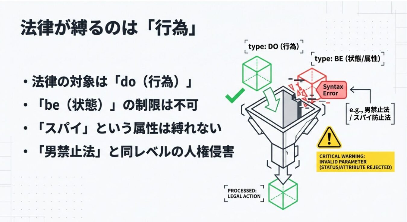• 「男禁止法」と同レベルの思考停止:法律は「行為(Do)」を縛るものであり、「スパイ(属性・Be)」を禁じる法律は人権侵害であり、立法センスが絶望的に欠如している。
