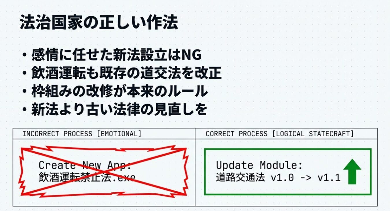 法律の正しい作り方を、もう一つの例で説明しよう。 かつて福岡の海の中道で、飲酒運転による極めて悲惨な死亡事故が起きた 。あの時、日本社会は「二度とこんな事故を起こしてはならない」と怒りに震えたが、だからといって感情に任せて「飲酒運転禁止法」などという新法をポンと作ったわけではない
