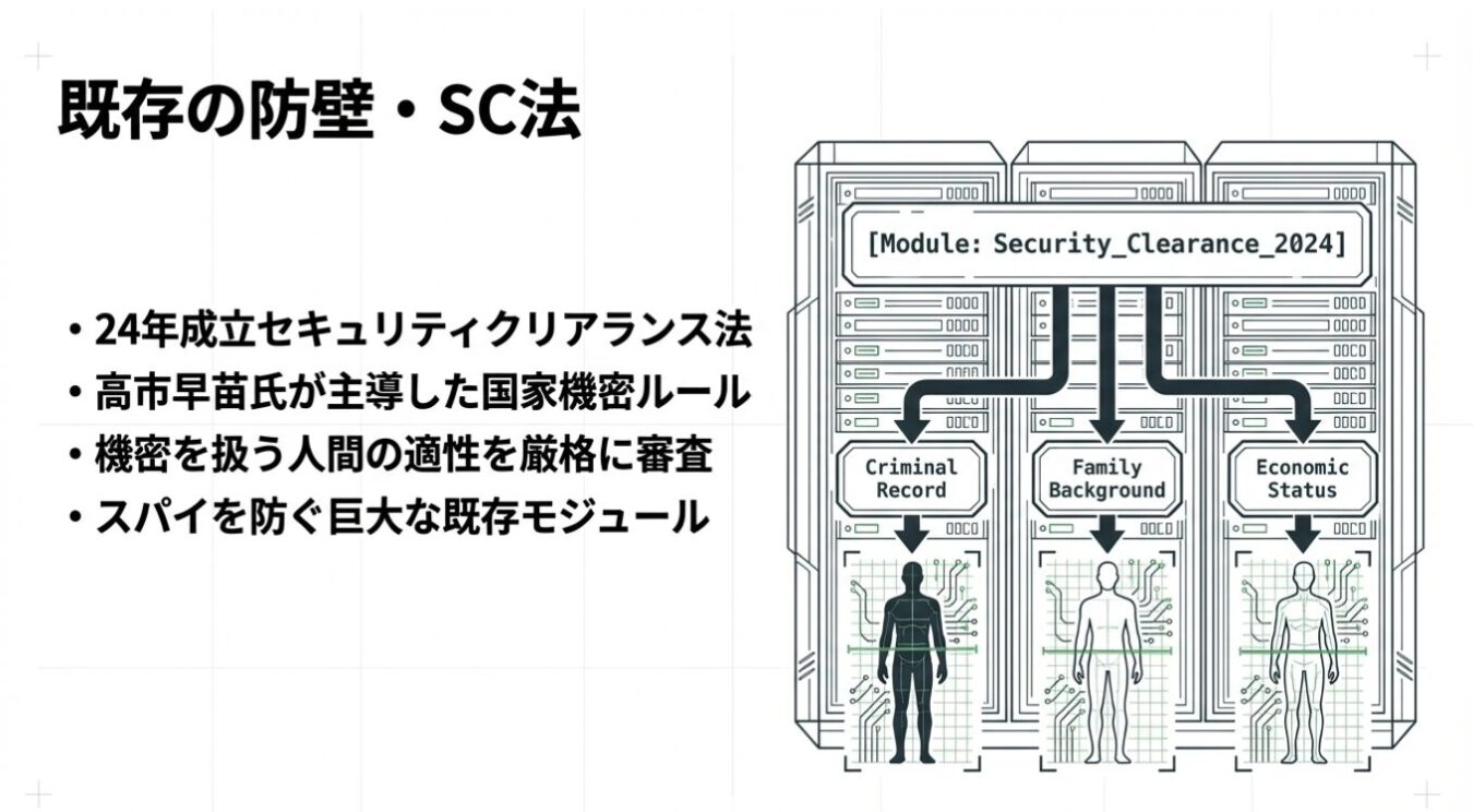 今「スパイ防止法を作れ」と叫んでいる連中がやろうとしていることは、まさにこれだ。 高市早苗氏が2年前に作った「セキュリティクリアランス法」という既存のモジュールがあるにもかかわらず 、それを無視して感情で新法をネジ込もうとする。それは明治時代から続く日本の立法プロセスを踏み外す行為であり、日本という法治国家の敵、すなわち売国奴である 。同時に「高市早苗の仕事は無能だった」と喧伝しているのと同じであり、彼女の政治的息の根を止める敵でもある