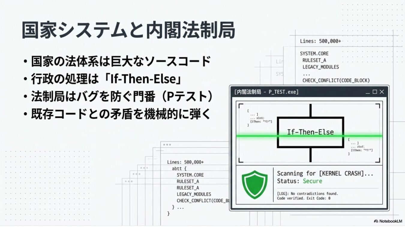 Pythonでコードを書く人間ならわかるだろう。内閣法制局がやっているのは「Pテスト」である 。既存の法律と新しい法律が合わさった時に矛盾が生じないかを、思想の右・左など関係なく、機械的に確認し続けている 。彼らが下すのは価値判断ではなく、「このコードは走るか、走らないか」という極めて「決定論的判断」なのだ