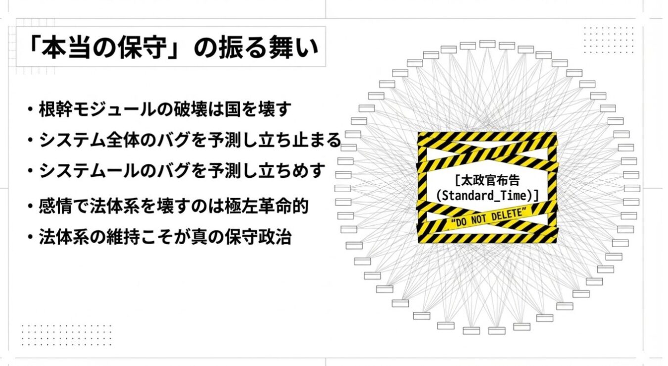 • 太政官布告と真の保守の知性:日本の標準時の根拠が明治の「太政官布告」であることを知り、他へのバグを恐れて時差特区を諦めた議員たち。彼らこそが、法治国家の作法を弁えた本物の保守である。
