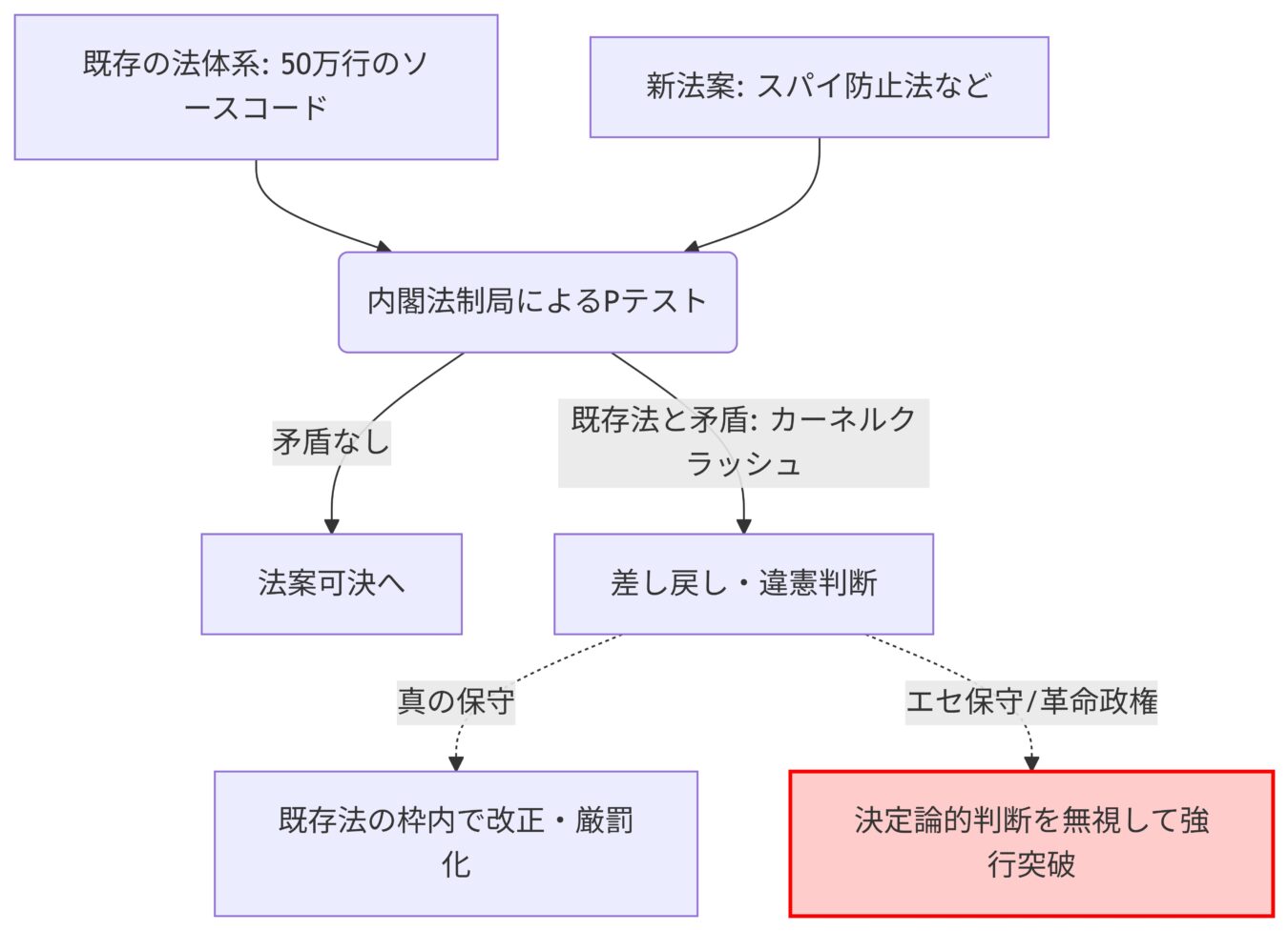 • 内閣法制局の「Pテスト」を壊した大罪:既存コードとの矛盾(カーネルクラッシュ)を弾く法制局の機械的判断を、感情でへし折った安倍政権やエセ保守は、国家システムの破壊者(極左革命政権)である。