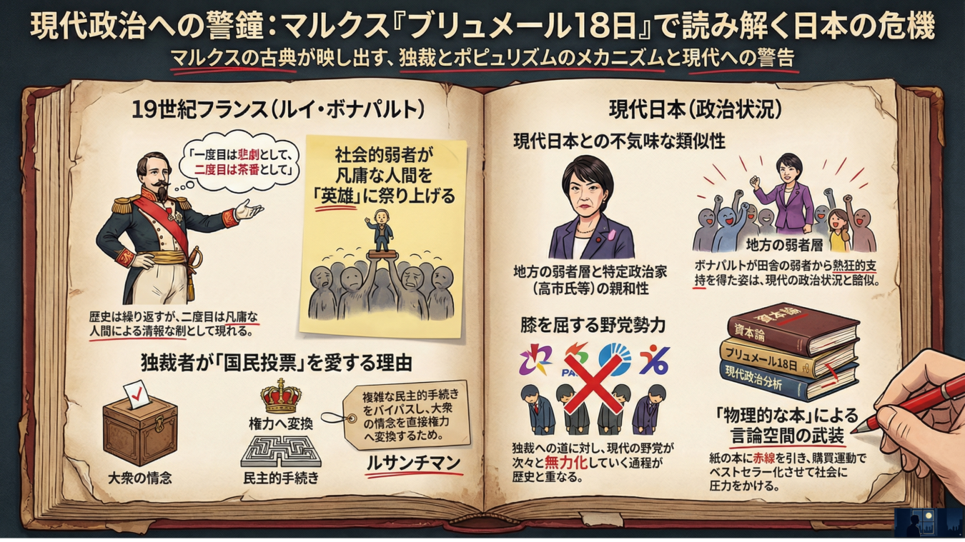 【結論】 現代日本の政治状況(特に高市早苗氏などへの熱狂)は、19世紀フランスにおけるルイ・ボナパルトの台頭と極めて不気味な一致を見せています。大衆がいかにして凡庸な人物を「救世主」として祭り上げ、独裁体制を自ら招き入れてしまうのか。この歴史的メカニズムを解き明かすマルクスの古典『ルイ・ボナパルトのブリュメール18日』は、単なる歴史書ではなく、今の日本を生き抜くための「最強の実用書」です。