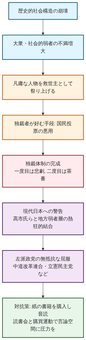 - 歴史の反復と茶番: 歴史的な社会構造が崩壊した時、大衆はしょうもない人間を英雄として祭り上げる。一度目は悲劇として、二度目は茶番として歴史は繰り返されます。