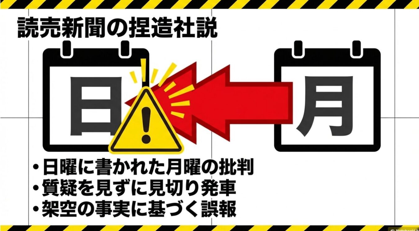 2. メディアの敗北と「捏造社説」: 読売新聞は、月曜日に始まる立憲民主党の質疑を一切見ずに、日曜日の党大会の段階で「高市政権の揚げ足取りばかり」と批判。これは架空の事実に基づく完全な捏造である。