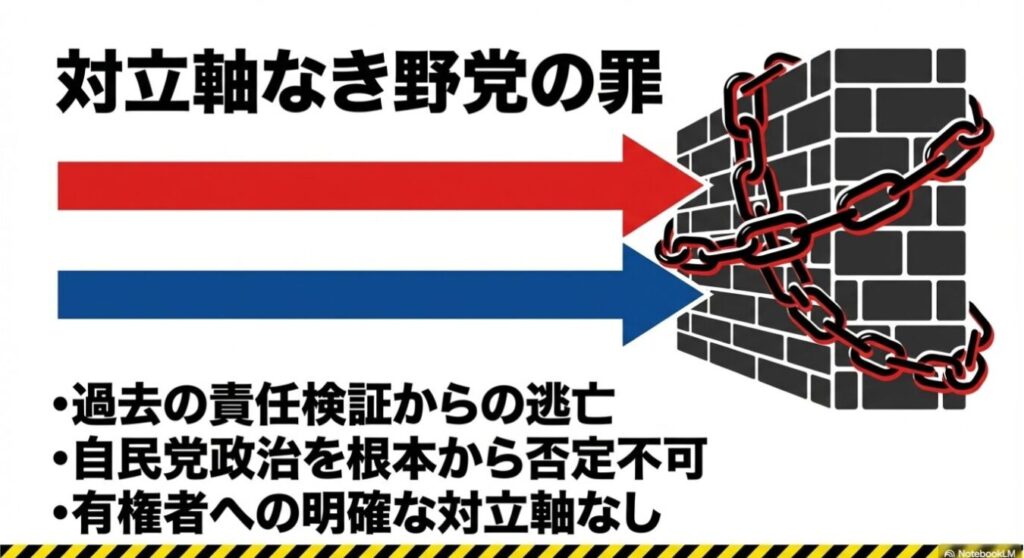 3. 対立軸なき野党の気持ち悪さ: 中道改革連合が選挙に弱いのは、公明党との過去のしがらみから自民党政治を根本から否定できず、明確な対立軸を示せないからだ。戦う気がないのにリングに上がるのは偽善であり、有権者に対する背信行為である。