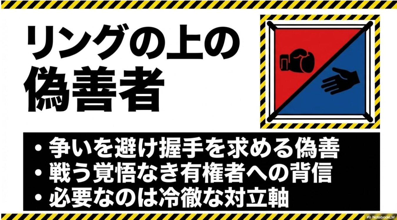 自ら赤コーナーと青コーナーに分かれたリングに上がっておきながら、「争いは良くないから握手しましょう」と相手に歩み寄るようなボクサーを、観客はどう思うだろうか。それは不潔であり、偽善であり、何より「気持ち悪い」のである。