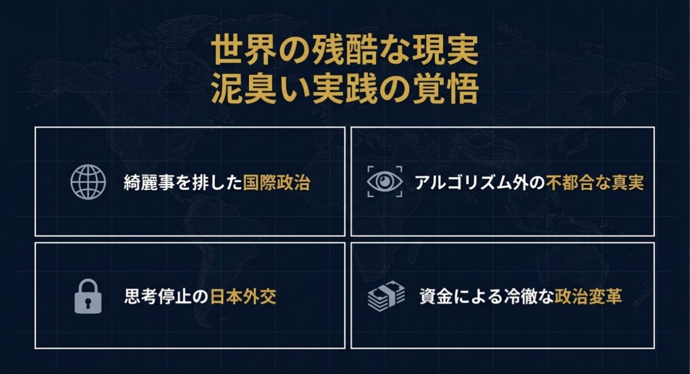 アメリカの暴走と中国の台頭。こんなえげつない世界で、口先だけの綺麗事やお題目を唱えていて何が変わるというのか。現実の政治を変えるには、泥臭い「実弾」が必要だ。