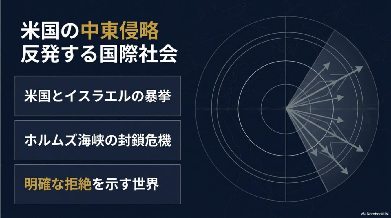 中東で起きていることは、紛れもなくアメリカとイスラエルによる「侵略」である 。 トランプがホルムズ海峡を封鎖すると言い出し、実際に事態は動き始めている 。この傍若無人な振る舞いに対し、世界中は「アメリカひどいよ」「イスラエルひどいよ」と明確に声を上げている 。「イランも反抗せなあかんのは分かるけど、ホルムズ海峡封鎖はあかんわ」というのが世界の真っ当な声だ