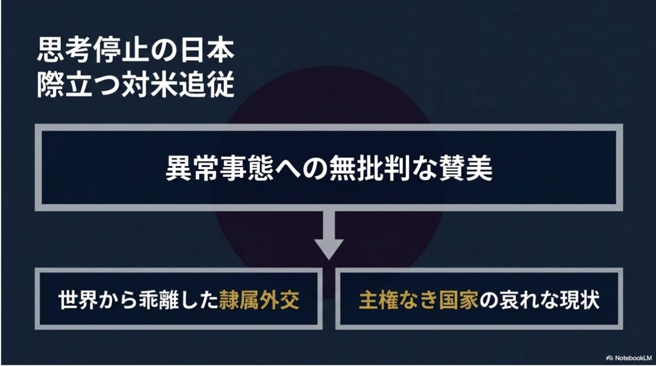 「思考停止の日本 際立つ対米追従」という題名の下、「異常事態への無批判な賛美」という項目から「世界から乖離した隷属外交」と「主権なき国家の哀れな現状」という二つの結果が導き出される構造を示した図。