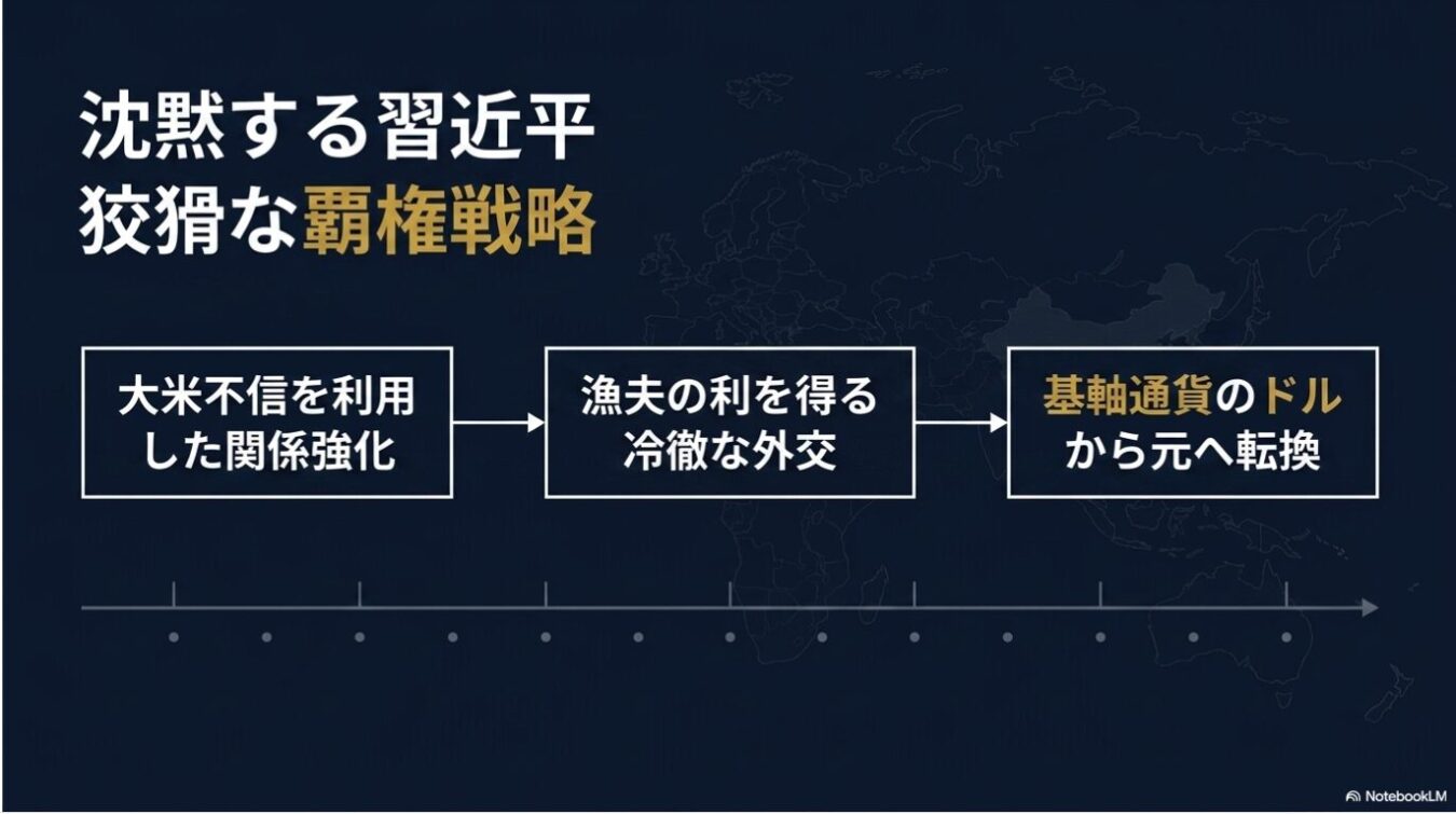 「沈黙する習近平 狡猾な覇権戦略」と題し、大米不信の利用、冷徹な外交による漁夫の利、ドルから元への基軸通貨の転換という3つの段階が矢印で示された、世界地図を背景にした図解。