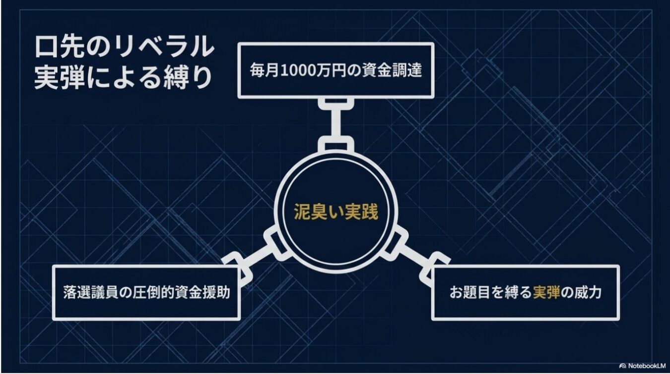 「泥臭い実践」を中央に配し、周囲に「毎月1000万円の資金調達」「落選議員の圧倒的資金援助」「お題目を縛る実弾の威力」という3つの項目を連結させた、「口先のリベラル実弾による縛り」と題された概念図。