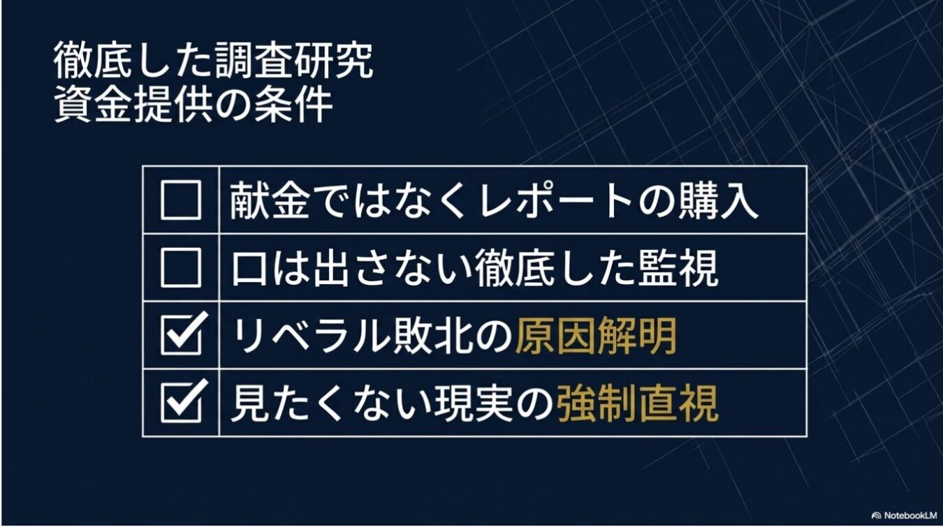 彼らに課すミッションはたった一つ。「リベラルな政策が、世の中からどれだけ嫌われているか」を徹底的に調査し、レポートを出せ。それだけだ 。 寄付や政治献金ではない 。金を払ってレポートを買うのだ 。金は出すが口は出さない。ただし、徹底的に読ませろ 。カネという実弾で退路を断ち、「なぜ自分たちが嫌われるのか」という見たくもない現実を直視させる。これが我々の狂気のプロジェクトである。