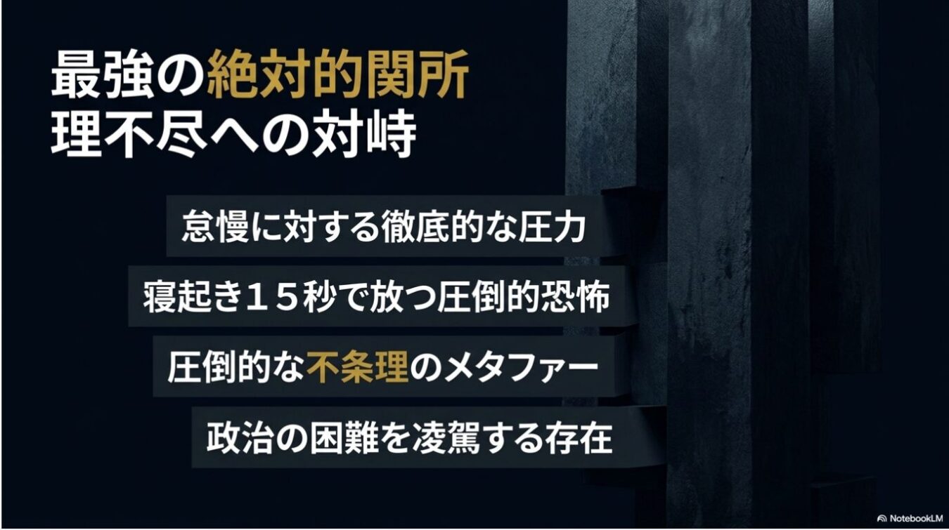 暗い背景に、タイトル「最強の絶対的関所 理不尽への対峙」と、4つの箇条書き「怠慢に対する徹底的な圧力」「寝起き15秒で放つ圧倒的恐怖」「圧倒的な不条理のメタファー」「政治の困難を凌駕する存在」が記されたスライド画像。