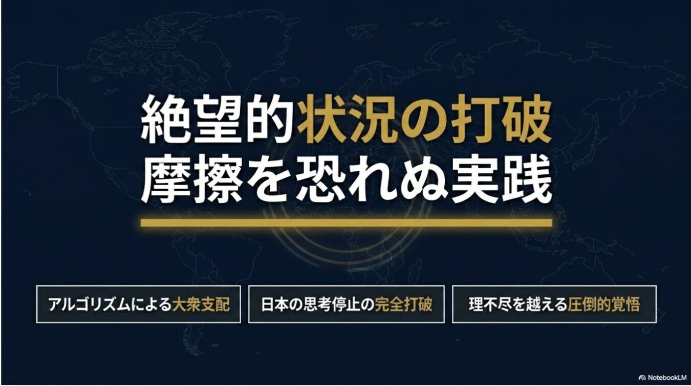 世界地図を背景に、「絶望的状況の打破 摩擦を恐れぬ実践」という大きな見出しと、「アルゴリズムによる大衆支配」「日本の思考停止の完全打破」「理不尽を越える圧倒的覚悟」という3つの項目が書かれたプレゼンテーションスライド。