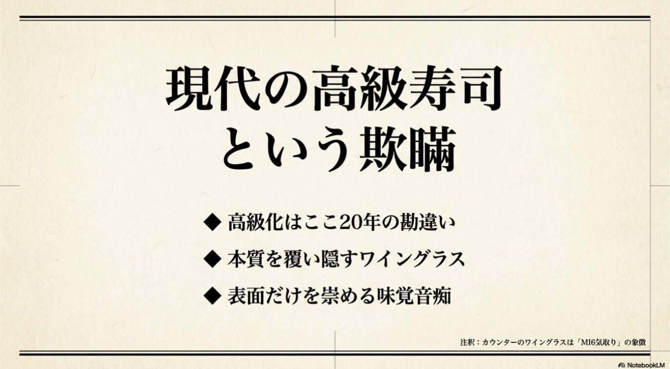 世の中には、本質を見失って表面だけをありがたがる味覚音痴があまりにも多い。その最たる例が、現代の「高級寿司屋」だ。