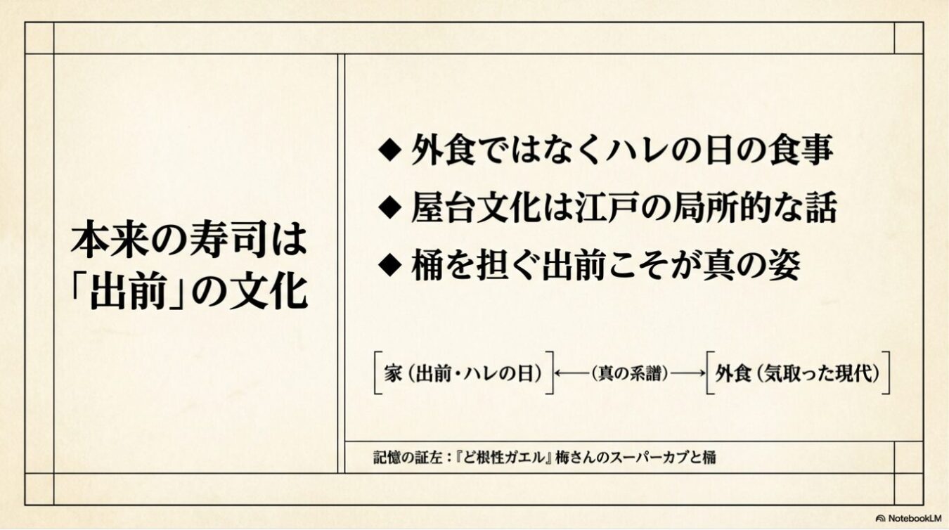 - ワイングラスを傾ける「MI6気取り」の高級寿司屋は、ここ20年の勘違い。西日本を中心に、本来寿司はハレの日に「出前で家で取るもの」であった 。