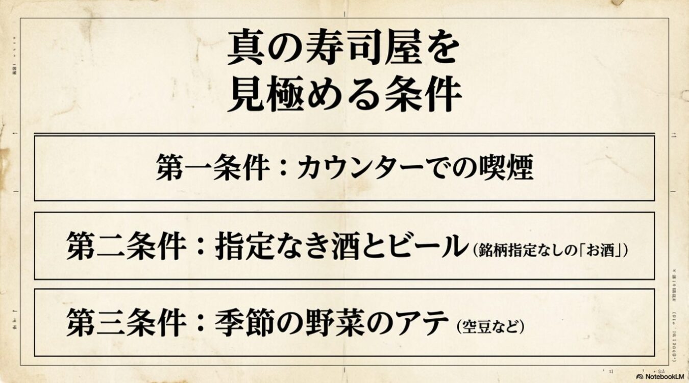 さらに、うまい寿司屋の条件の第二は「酒はビールと日本酒(銘柄指定なしの『お酒』)しかないこと」、第三は空豆などの「野菜のアテが売っていること」だ 。昔の寿司屋というのは寿司専門ではなく、ありとあらゆるものを出す「総合飲食店(今でいう居酒屋)」だったからである 。