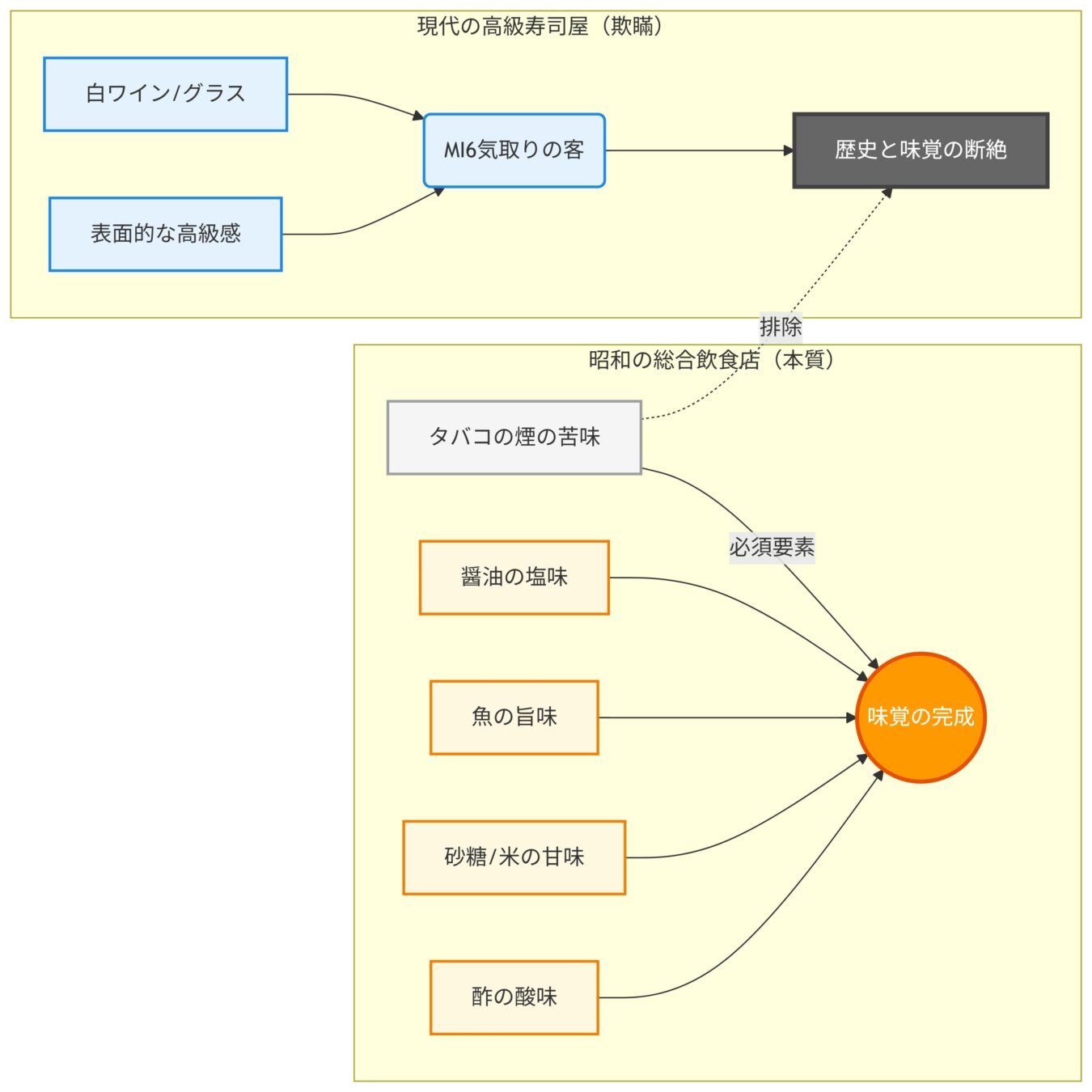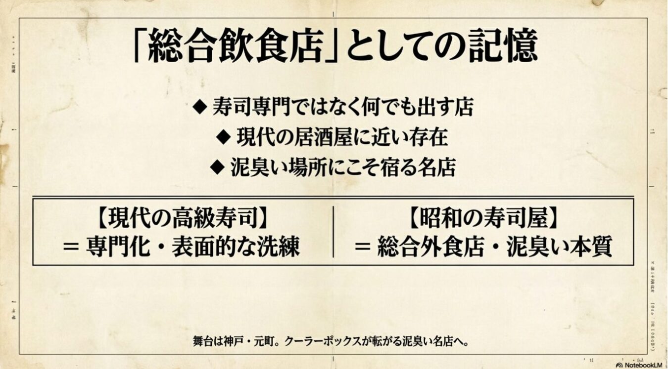 現代の気取った高級寿司屋は、寿司本来の歴史と味覚を忘却した味覚音痴による欺瞞である 。本来、寿司とは「タバコの煙」や「不良の熱気」が混じり合う昭和の総合飲食店で完成するものであり、その泥臭さの中にこそ真の本質が宿っている 。