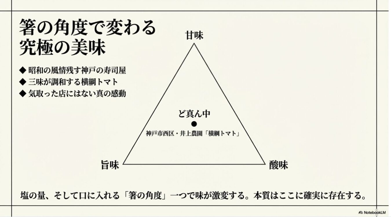 - 酸味・甘味・旨味・塩味の四味に「タバコの苦味」が加わって初めて寿司の味覚は完成する。箸の角度で味が激変する「神戸横綱トマト」の衝撃が、本質の味を証明している 。