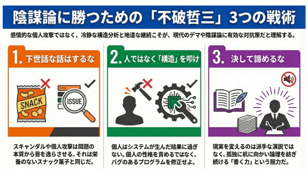 本稿で明らかにしてきた、不破哲三から学ぶべき陰謀論との戦い方を、ここに3つの原則として再整理する。