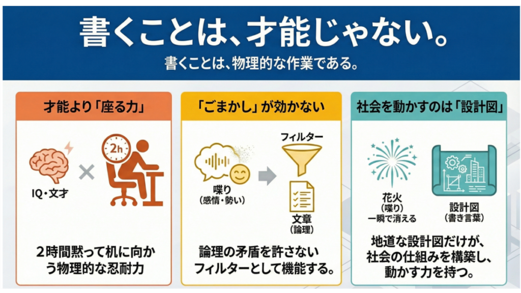 ここで言う「胆力」とは、抽象的な勇気や精神論のことではない。それは「2時間黙って机に向かい、論理的な文章を書き続けられる」という、具体的かつ身体的な能力を指す。文章を書くのに必要なのは、文才ではない。「同じ場所に2時間ずっと黙って座っていられるか」「誰にも見られない場所で、俯いて作業し続けられるか」。問われているのは、この孤独で退屈な物理的苦痛に耐える「座る力」、ただそれだけだ。