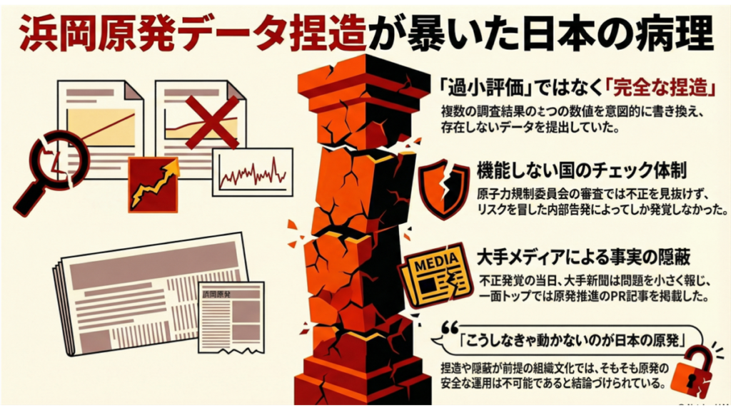 【結論】 中部電力・浜岡原発のデータ捏造問題は、単なる企業の不祥事ではない。これは「正直にやれば基準を満たせない日本型組織」と「それをチェックできない規制当局」、そして「腐敗を隠蔽する大手メディア」という、日本社会の構造的病理が「原子力」という危険な技術と致命的に相性が悪いことを証明する決定的な事件である。