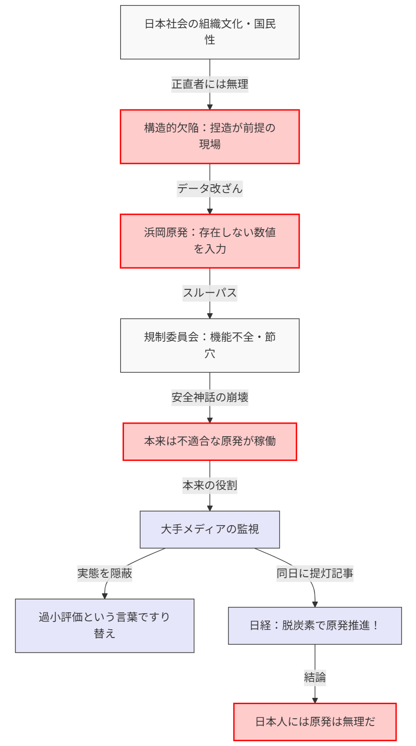 改めて、この事件が白日の下に晒した病理の悪循環を総括しましょう。 まず、**①「正直にやれば基準を満たせない」ため、組織ぐるみで不正を行うしかない「捏造でしか回らない現場」**が存在します。この犯罪的行為は、**②国の規制機関が捏造を全く見抜けず、チェック機能が完全に形骸化している「公的監視システムの機能不全」**によって可能にされています。そして、この腐りきった構造全体が、**③腐敗した実態を覆い隠し、むしろ原子力推進のプロパガンダを垂れ流す「大手メディアと結託した隠蔽体質」**によって保護され、永続させられているのです。