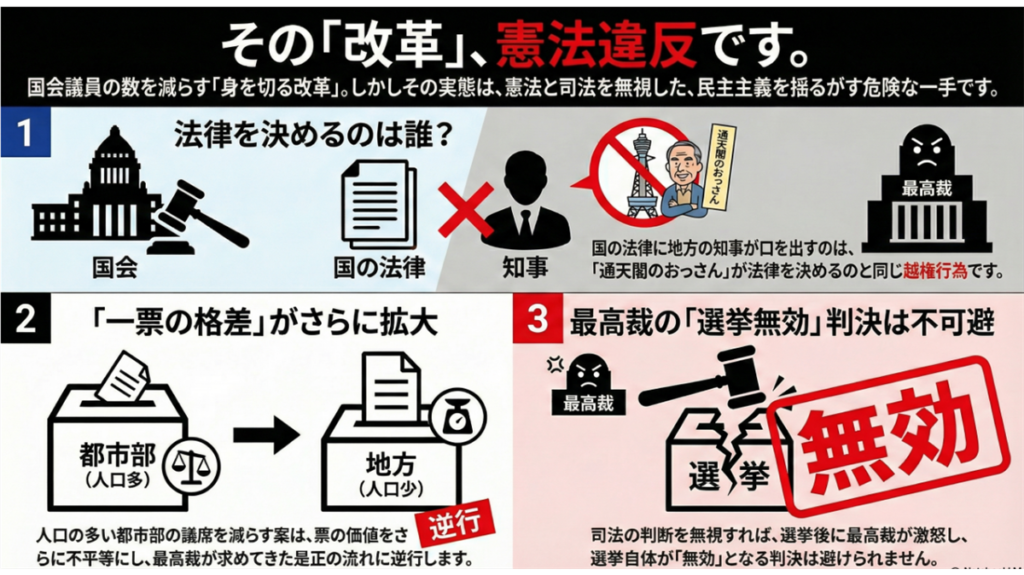 この議席削減論が抱える第二の落とし穴は、司法、特に最高裁判所との深刻な対立を引き起こし、最悪の場合、国政選挙そのものが「無効」になるという、国家的な危機を招くリスクです。