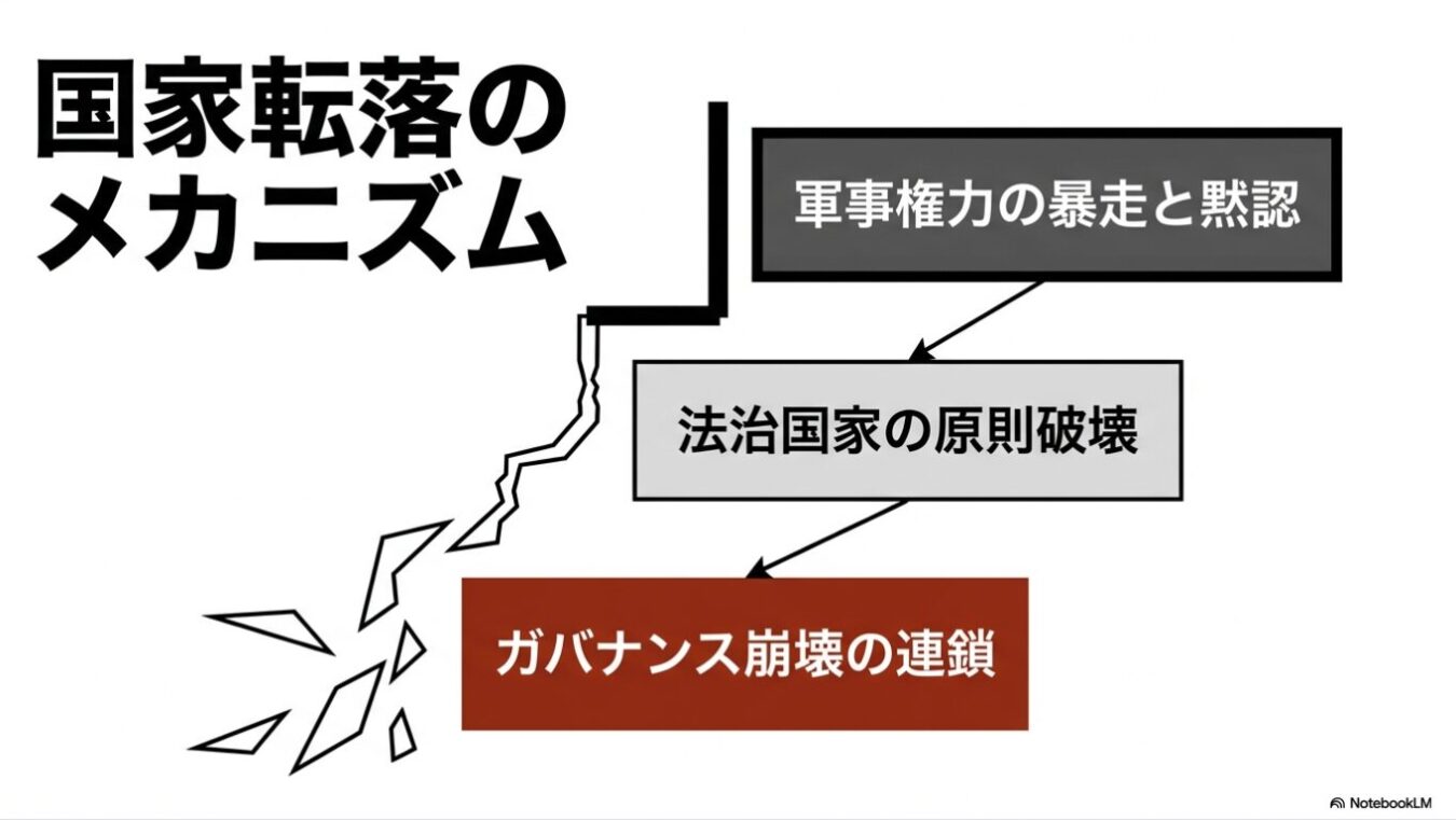 「国家転落のメカニズム」と題し、軍事権力の暴走と黙認が法治国家の原則破壊を招き、最終的にガバナンス崩壊の連鎖に至るプロセスを示したフローチャート。