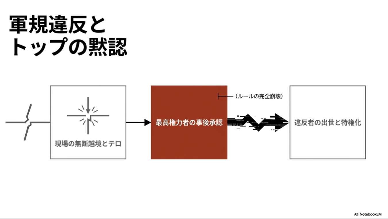 軍規違反から最高権力者の事後承認を経て、組織のルールが崩壊し、違反者が優遇される過程を示す図解。