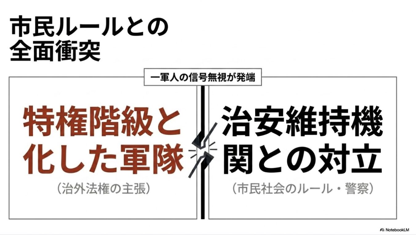 軍人の信号無視をきっかけに、特権階級化した軍隊(治外法権を主張)と治安維持機関(市民社会のルール・警察)が対立し、市民ルールと全面衝突している状況を示す図解。