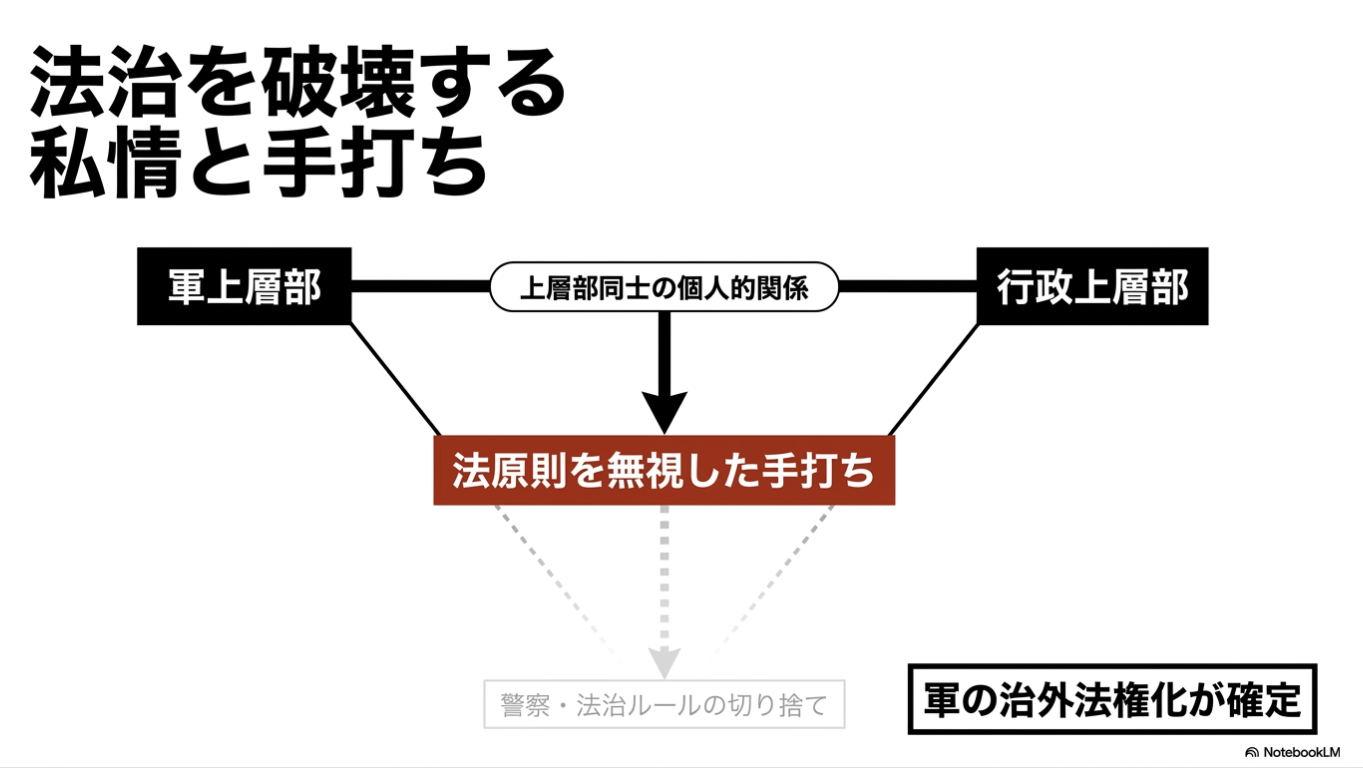 軍上層部と行政上層部が個人的関係に基づき、法原則を無視して「手打ち」を行うことで、警察や法治ルールが切り捨てられ、軍の治外法権化が確定するプロセスを示した概念図。