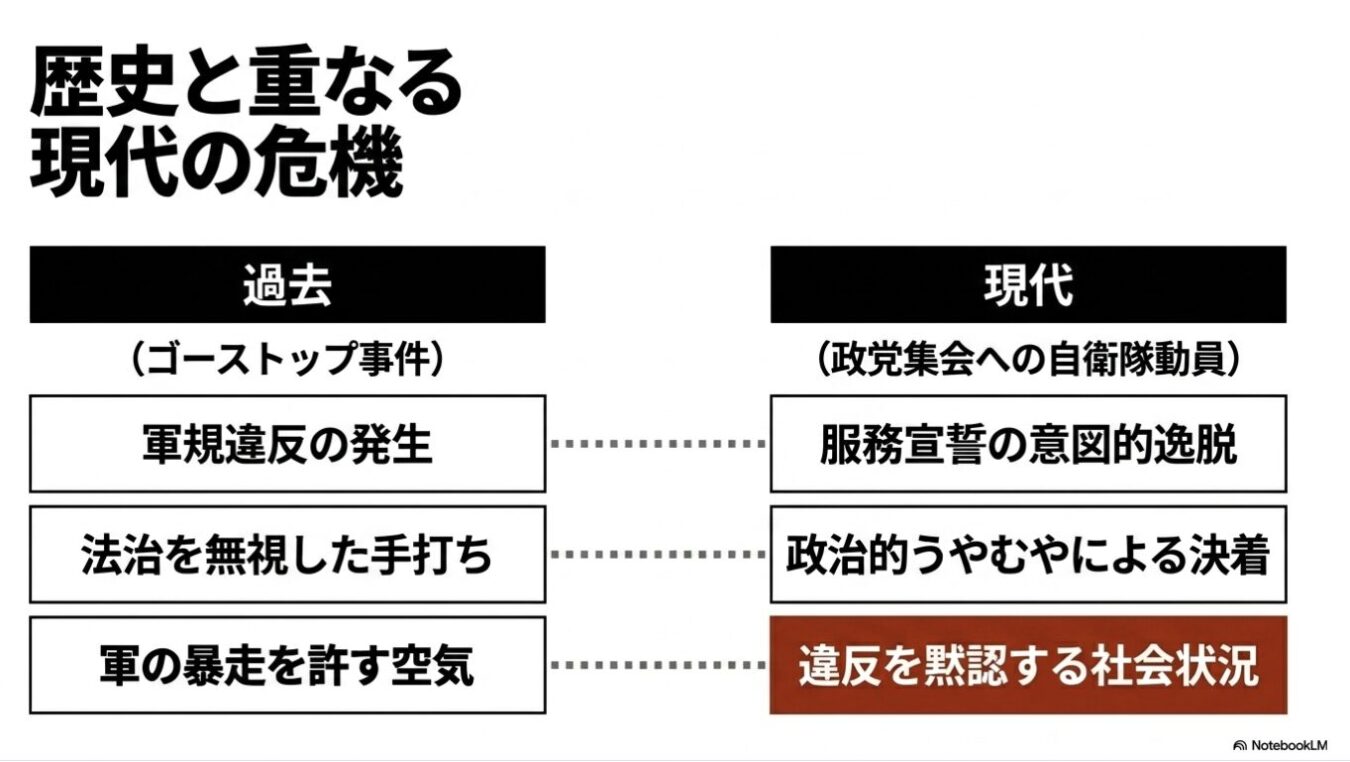 「歴史と重なる現代の危機」と題し、過去のゴーストトップ事件と現代の政党集会への自衛隊動員を対比させ、軍規違反、法治の軽視、社会の黙認という共通の構造を3段階で示した比較図。