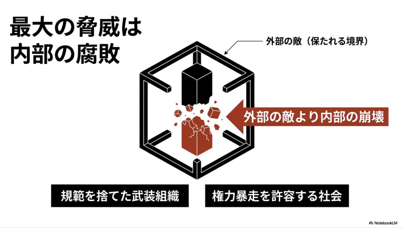 「最大の脅威は内部の腐敗」という見出しとともに、立方体の枠組みの中で内部の物体が崩壊する様子を描き、「外部の敵より内部の崩壊」「規範を捨てた武装組織」「権力暴走を許容する社会」と記された図解。