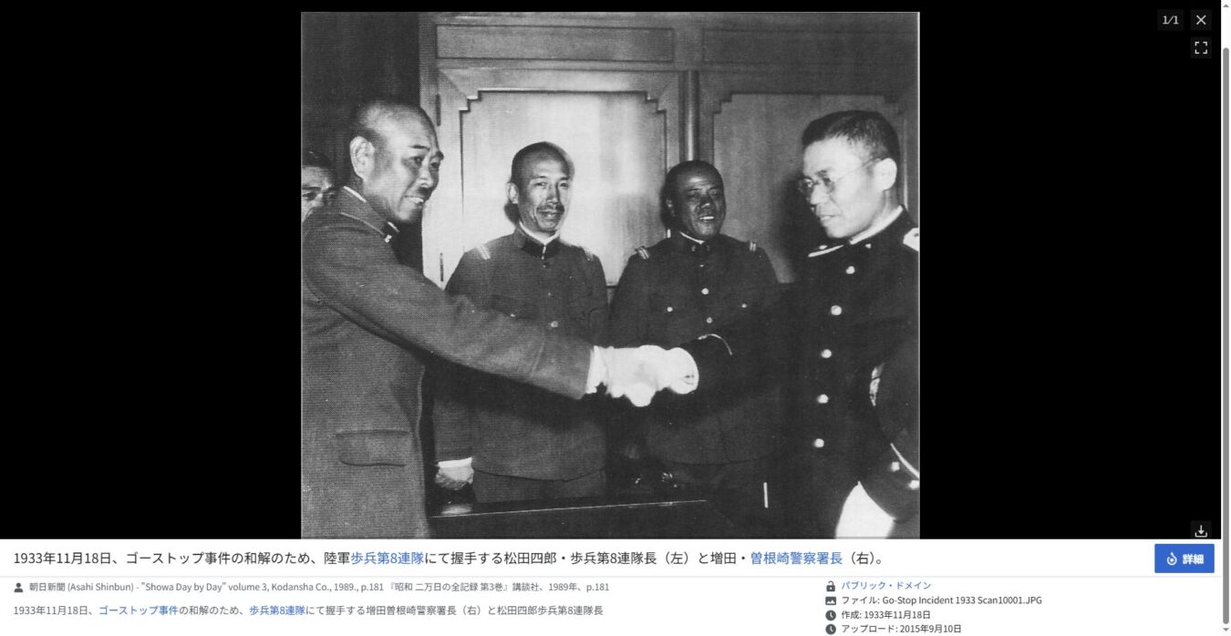 1933年11月18日、ゴーストップ事件の和解に伴い、陸軍歩兵第8連隊にて握手を交わす松田四郎連隊長と増田曽根崎警察署長。